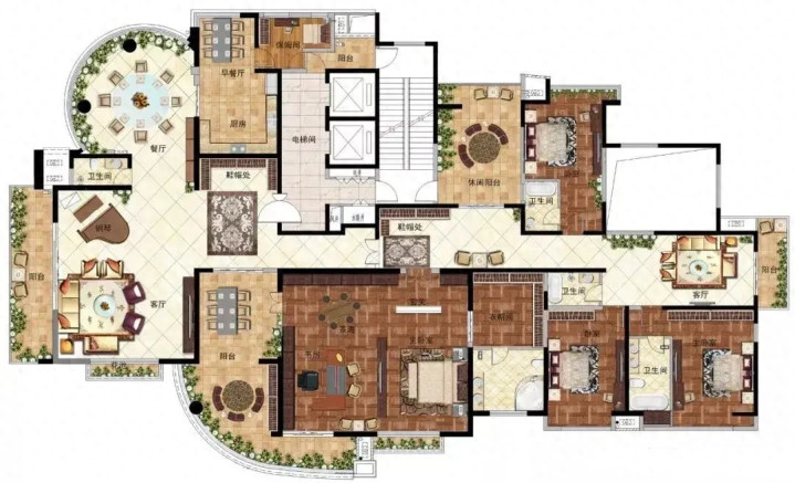 公共区与私密区的动线划分清晰,访客从入户进入后,不会穿过卧室区域,保证居住的私密性。厨房、储物间等辅助空间与主要活动区保持适当距离,既方便使用,又减少对公共区域的影响。整体布局符合大户型常见的动静分区原则,使家庭成员在不同区域活动时不会互相干扰。